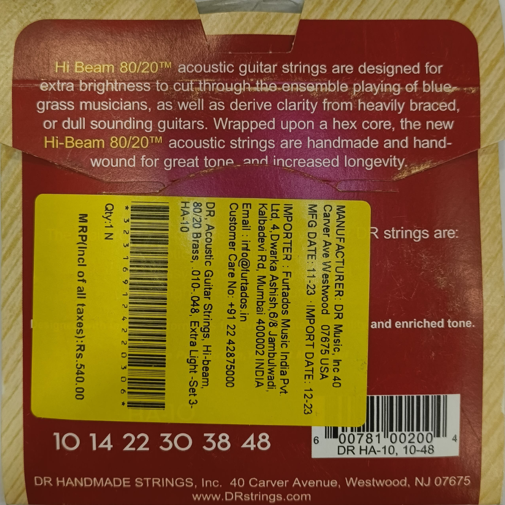 Unleash vibrant brightness and exceptional clarity with DR Strings 80/20 Bronze Acoustic Guitar Strings. This “Extra Light” (10-48) gauge set offers incredibly easy playability and a cutting tone, packaged in a corrosion-proof pack for lasting freshness. Hand-wound in the USA for superior quality.