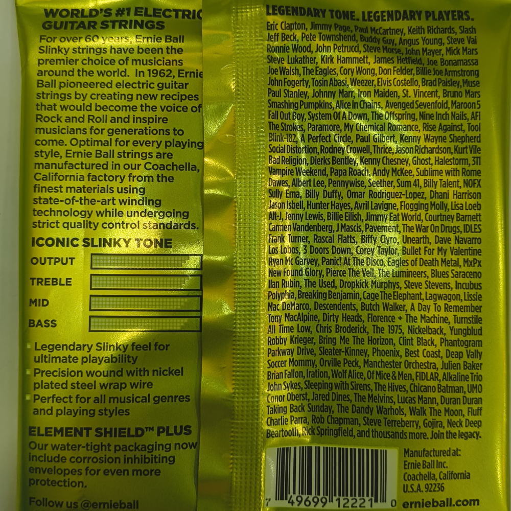 Discover the legendary bright, balanced tone and comfortable feel of Ernie Ball 2221 Regular Slinky Electric Guitar Strings. This “Custom Gauge” (10-46) set is a global best-seller, offering versatile sound and reliable performance for guitarists across all genres. Nickel wound, made in USA.